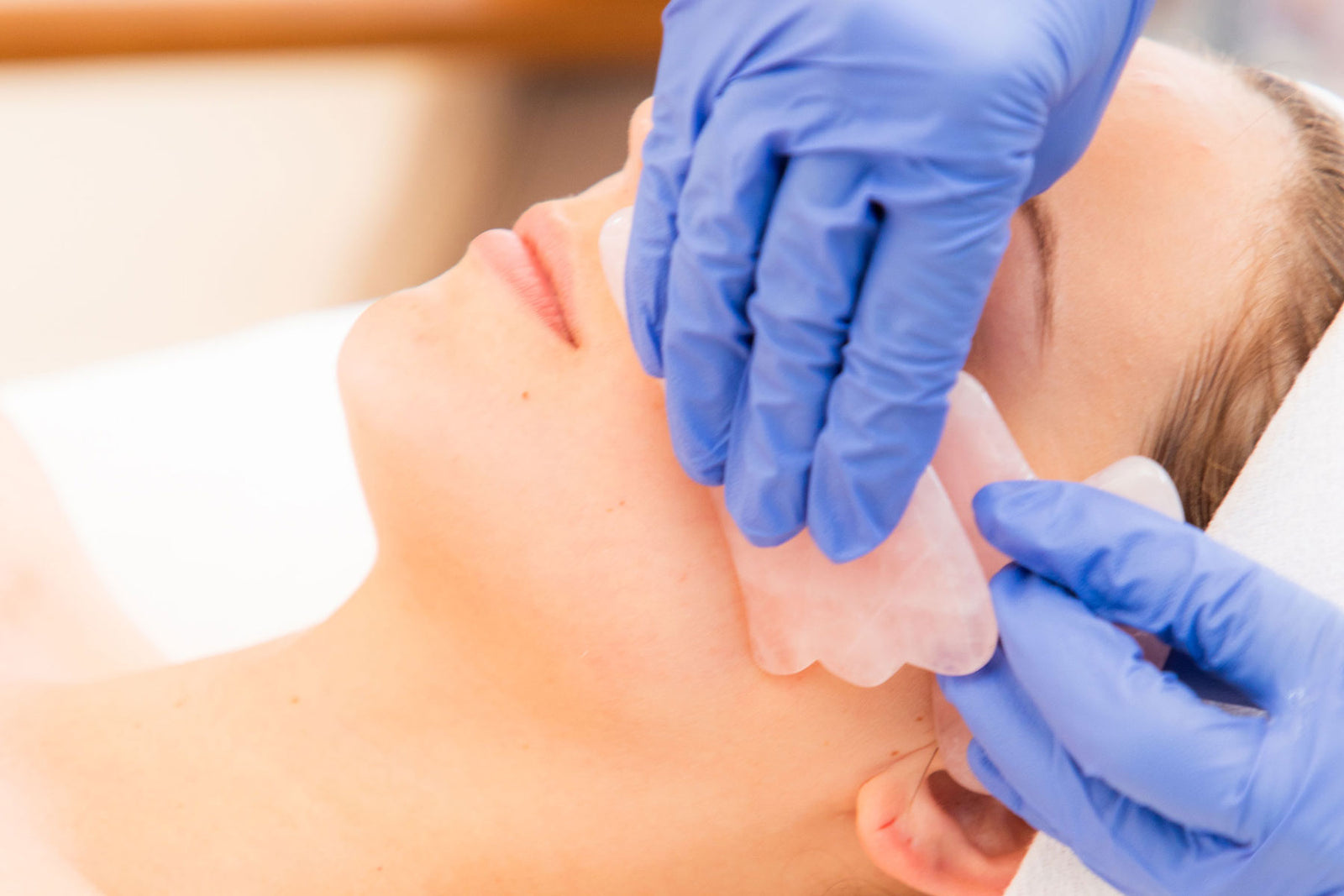 Facial Gua Sha is a massage technique designed to relieve tension in the muscles of the face, boost blood circulation, and encourage lymphatic drainage to reduce puffiness and excess fluid retention. It also helps break up fascia, the connective tissue that hugs muscles but can sometimes interfere with optimal circulation.